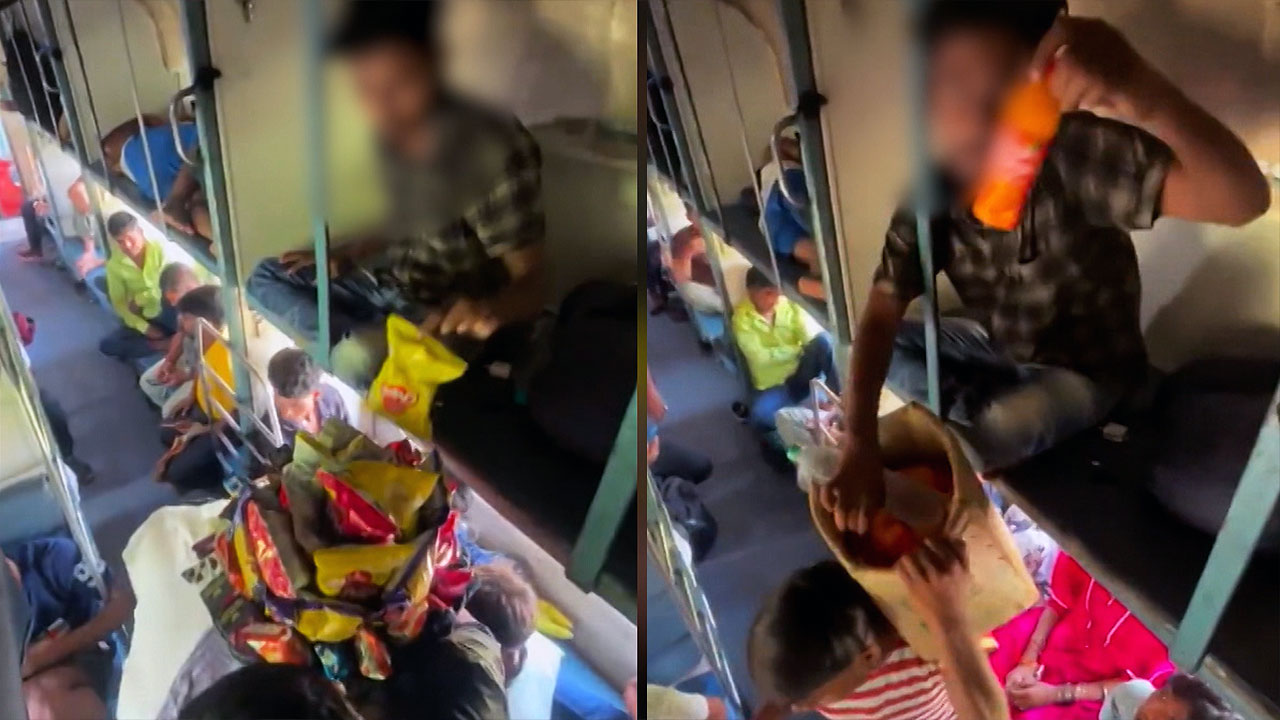 이동식 간식 판매원이 열차 객차 안을 지나가자 승객이 슬쩍 손을 뻗는데요.