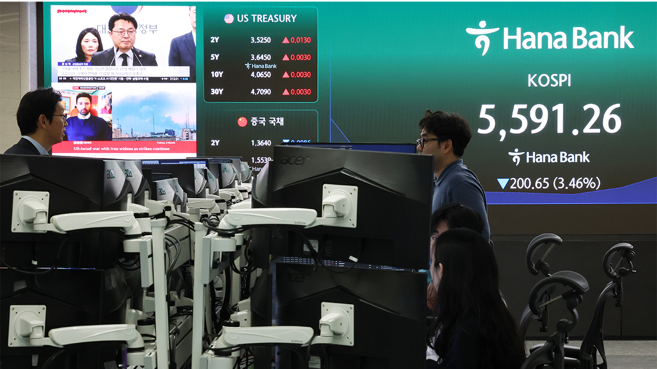 코스피가 오늘(4일) 미국과 이란 간 전쟁 발발 이후 중동 전역에 긴장감이 번지면서 급락해 5,550대로 밀려났습니다.