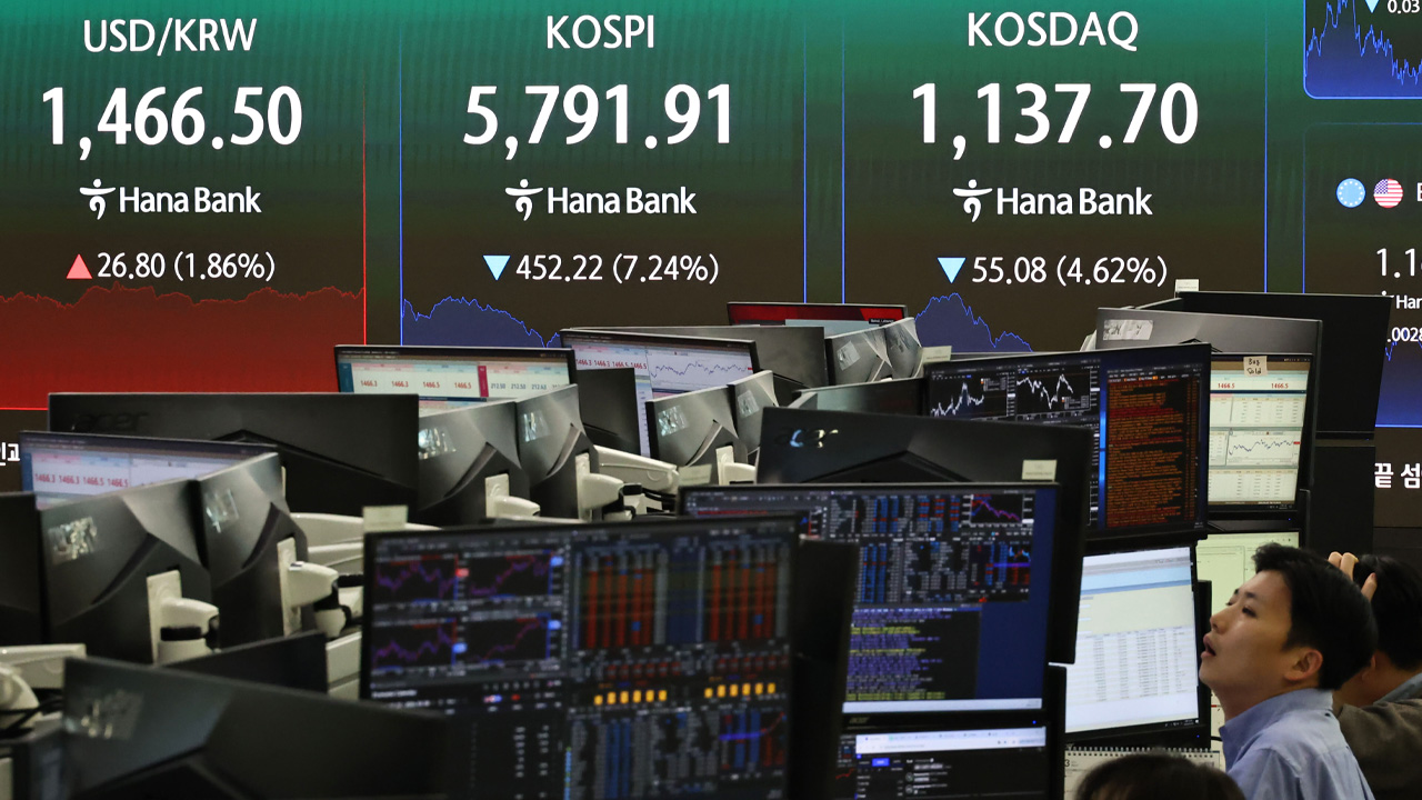 ▲ 미국과 이란의 전쟁으로 지정학적 불안감이 지속되고 있는 3일 서울 중구 하나은행 딜링룸 현황판에 코스피 지수 등이 표시되고 있다.
