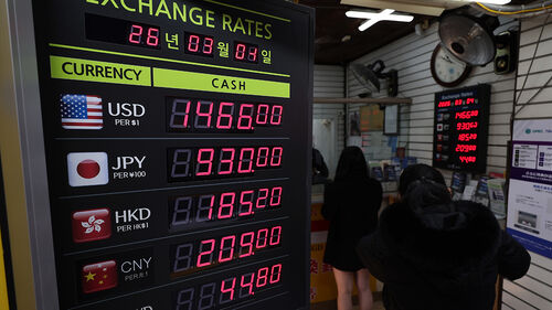 ▲ 중동 사태 여파로 원/달러 환율이 무섭게 치솟은 4일 서울 명동의 환전소에 환율이 표시돼 있다