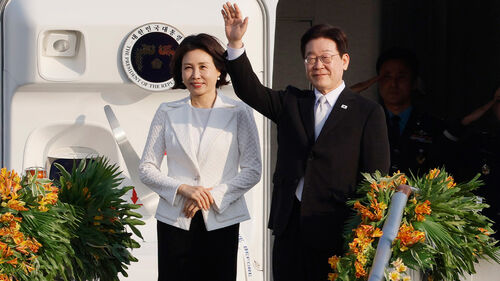 ▲ 필리핀 국빈방문을 마친 이재명 대통령과 김혜경 여사가 4일 빌라모어 군공항 공군 1호기에서 환송객에게 인사하고 있다.