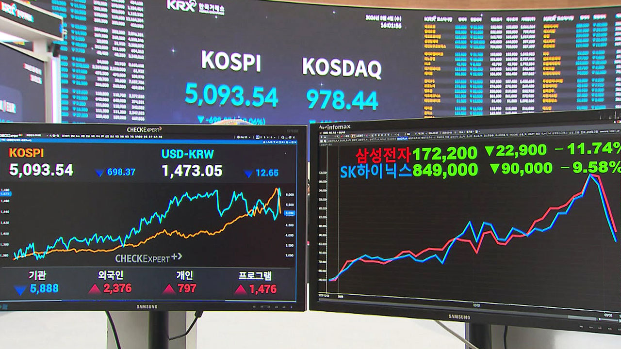 [박재현 기자 : 산이 높을수록 골이 깊다는 말이 있습니다. 코스피는 지난달에만 26% 넘게 오를 정도로 단기간에 급등한 만큼 조정 국면에서 하락 폭도 더 큰 상황입니다. 미국과 이란의 전쟁으로 외국인 투자자들이 위험 자산인 주식을 팔아서 달러 같은 안전 자산으로 가고 있습니다. 아시아 국가들이 그렇지만, 특히 우리나라의 중동산 원유에 대한 의존도가 큰 것도 하락의 원인으로 꼽히고 있습니다. 또, 그동안 증시를 방어하던 개인들의 투자 심리도 얼어붙으면서 패닉 매도 현상으로 이어졌습니다. 일단 전쟁 장기화 조짐에 단기가 하락세는 불가피하다는 전망이 많습니다. 여기에 돈을 빌려 투자하는 빚투와 관련해서 주가 하락으로 담보 가치가 일정 수준 미달할 경우에 증권사가 주식을 강제로 파는 '반대매매' 물량이 나올 거란 우려도 있습니다. 다만, 주가 상승을 주도해 온 반도체 업종의 실적 전망에 별다른 변화는 없는 상황이고, 어제(3일)와 오늘 낙폭은 전쟁 장기화나 이후 수출 차질까지 반영한 수준이어서 어느 정도는 바닥을 다졌다고 보는 시각도 있습니다.]