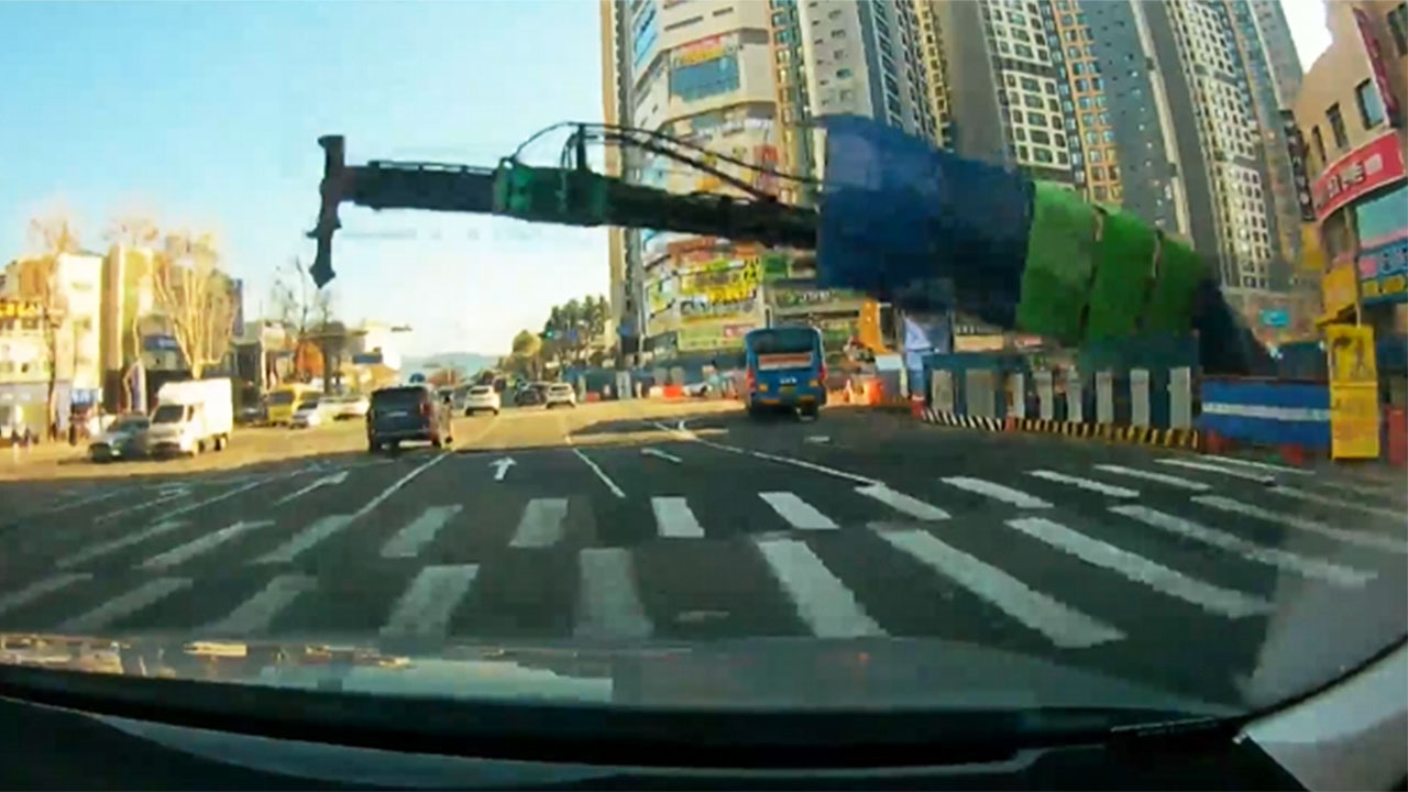 [택시 기사 : 신호를 받고 가고 있으니까 천공기가 갑자기 넘어오는 거예요. 브레이크를 밟아서 천만다행이죠. 승객하고 둘이 그래서 살았다고 소리 질렀는데요.]