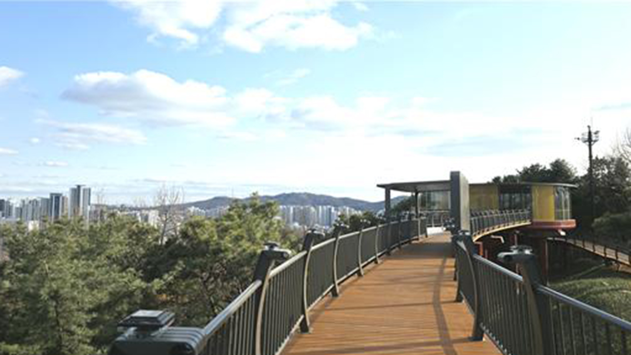 스카이워크는 55억 원의 사업비를 들여 공원 상부에서 도심을 조망할 수 있는 형태로 만들어졌습니다.