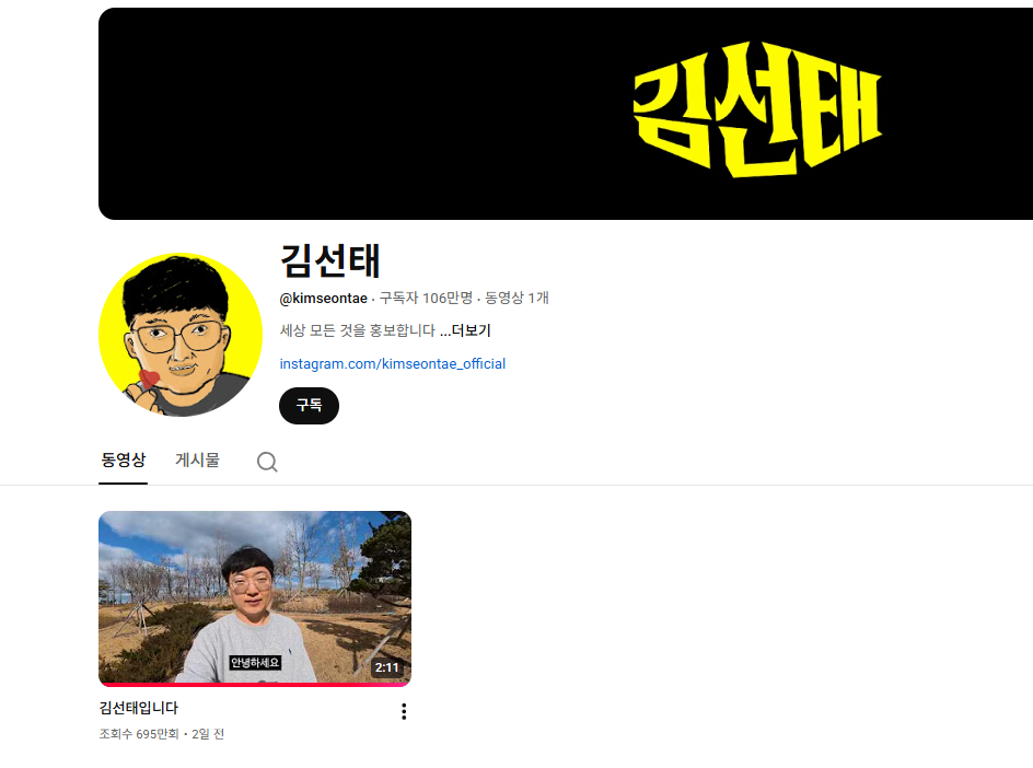 김선태 씨는 지난 2일 개인 유튜브 채널 '김선태'를 개설했다. 채널은 개설 3일 만인 지난 5일 오후 6시 51분 구독자 수 100만 명을 넘어서며 빠르게 성장했다. 김 씨는 채널 커뮤니티를 통해 "구독자 100만 감사합니다. 궁금한 것을 댓글에 남겨주세요."라며 감사 인사를 전했다.