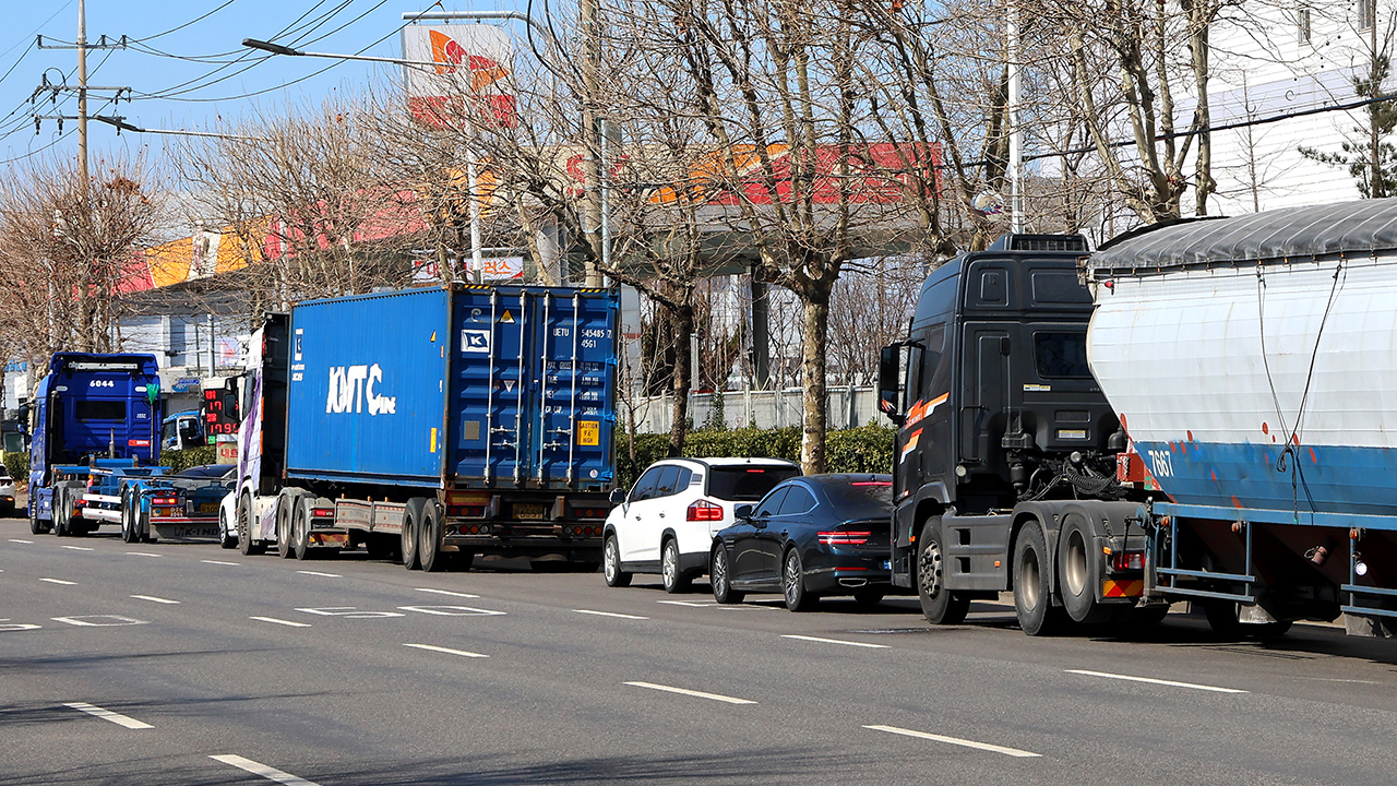 ▲ 7일 인천 중구의 한 주유소 앞에 저렴한 가격의 주유소를 찾는 대형 화물차량과 승용차들이 늘어 서 있다.