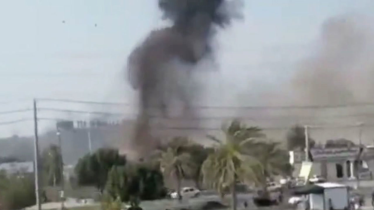 이란 남부 도시 미나브 상공으로 미사일이 날아들고, 검은 연기가 솟구칩니다.