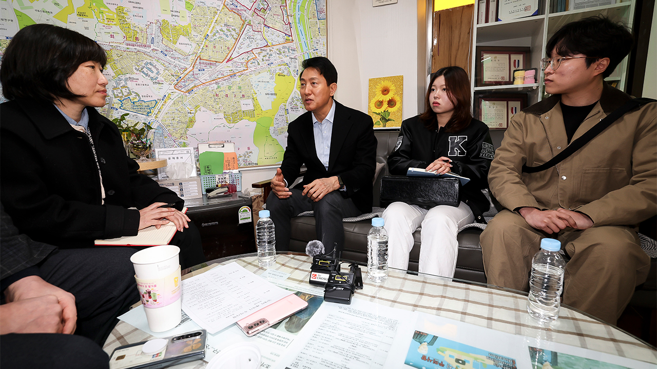 ▲ 오세훈 서울시장이 9일 서울 동대문구 휘경동의 한 공인중개소에서 1인 가구 청년들의 애로사항을 청취하며 대화하고 있다.