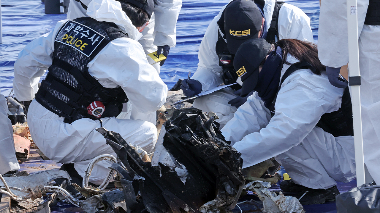 ▲ 지난 2월 12일 무안국제공항에서 국립과학수사연구원 관계자들이 12·29 제주항공 여객기 참사 사고기 잔해를 조사하고 있다.