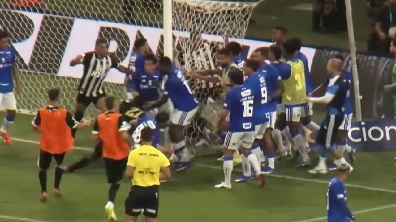 아틀레치쿠 미네이루의 골키퍼 에베르송이 벌떡 일어나 크리스티안을 밀어 넘어뜨린 뒤 무릎으로 가슴팍을 짓누르며 거칠게 다루자 곧바로 크루제이루 선수들이 달려와 집단 몸싸움이 시작됐습니다.