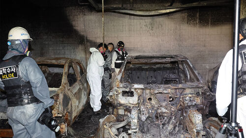 ▲ 2024년 8월 2일 오전 인천 서구 청라 아파트 지하 주차장 화재 현장에서 경찰과 소방 등 관계자들이 합동 감식을 하고 있다.