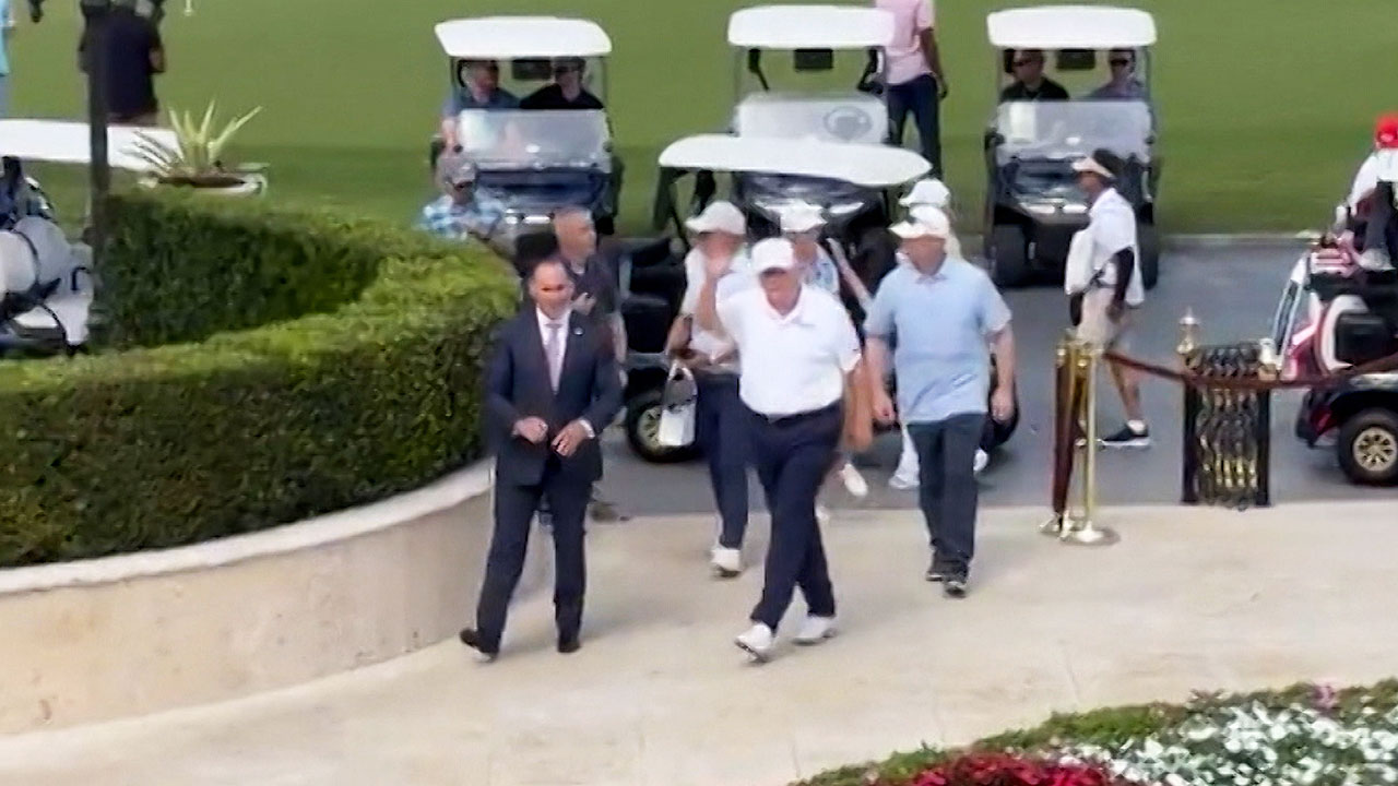 현지시간 지난 8일, 흰색 모자와 골프복 차림의 트럼프 대통령이 자신 소유의 마이애미 골프장에 등장했습니다.