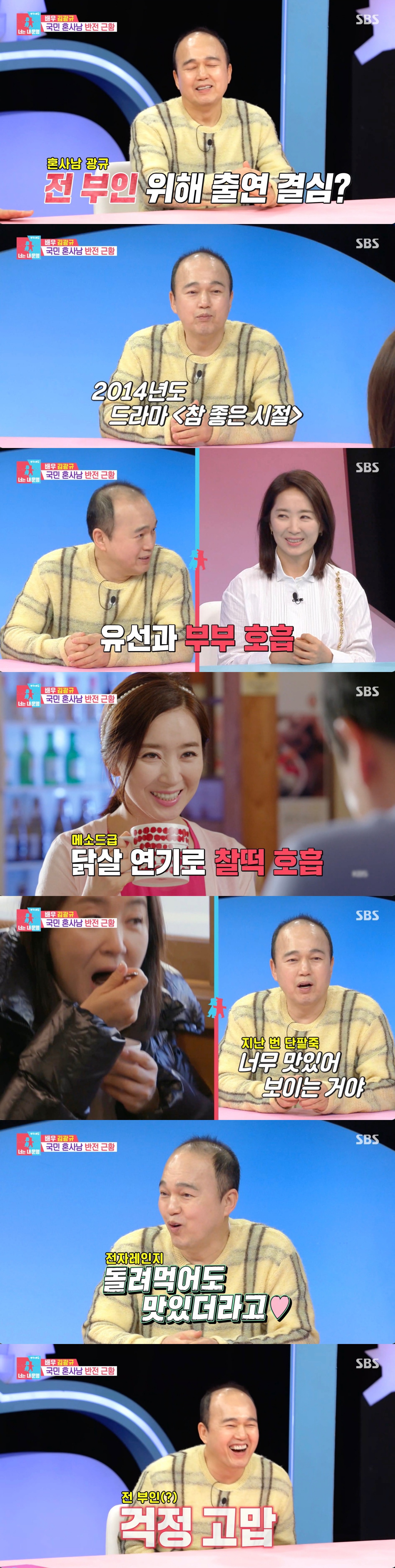 이날 김광규는 전 부인 때문에 출연을 했다고 밝혀 눈길을 끌었다. 그는 "윤유선 씨가 드라마 '참 좋은 시절'에서 아내 역이었다"라고 설명했다.