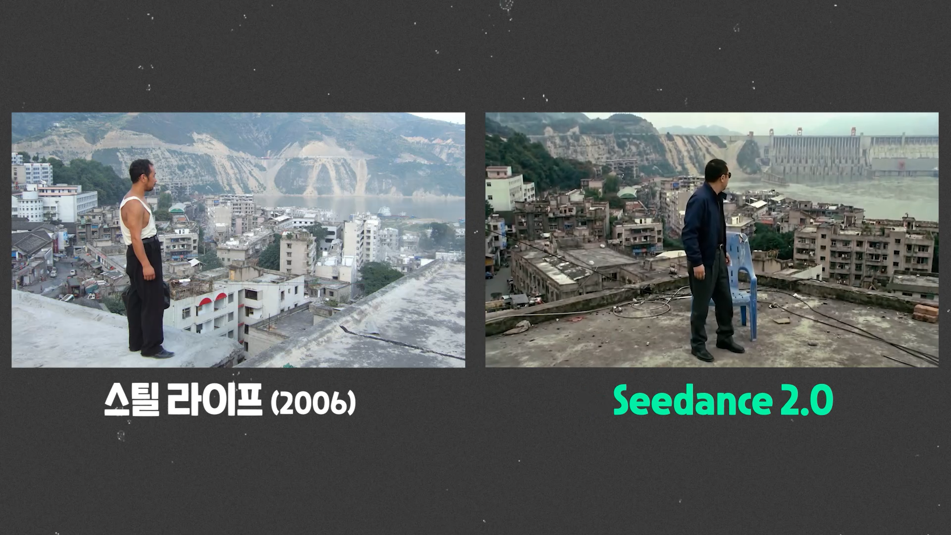 단순히 특정 시퀀스를 대체하는 걸 넘어서 이미 AI 모델로 단편 영화도 만들어지고 있습니다. 바이트댄스는 모델 공개와 더불어서 중국 영화계 거장인 지아장커와 함께 5분 31초 분량의 단편 영화를 공개했어요 이 영화에는 지아장커의 대표작들이 AI로 생성되어 담겨 있죠. '산하고인'의 춤추는 장면, 또 '스틸라이프'에 담겼던 산샤 댐 수몰 직전의 마을 모습들도 AI가 뚝딱 만들어냈어요.
