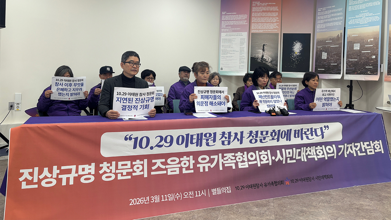 10·29 유가족협의회와 이태원 참사 시민대책회의는 청문회를 하루 앞둔 오늘(11일) 종로구 '별들의 집'에서 기자간담회를 열고 "윤 전 대통령이 끝내 청문회 출석을 거부한 데 유감의 뜻을 밝힌다"고 밝혔습니다.