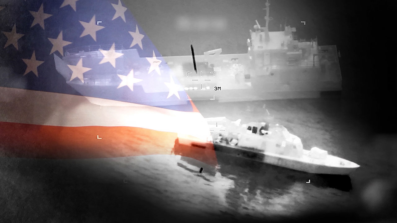 바다 한복판에 떠 있는 함정, 승무원들이 앉아 있는 갑판에 조준선을 따라 검은 물체가 날아들고 곧바로 큰 폭발이 일어납니다.