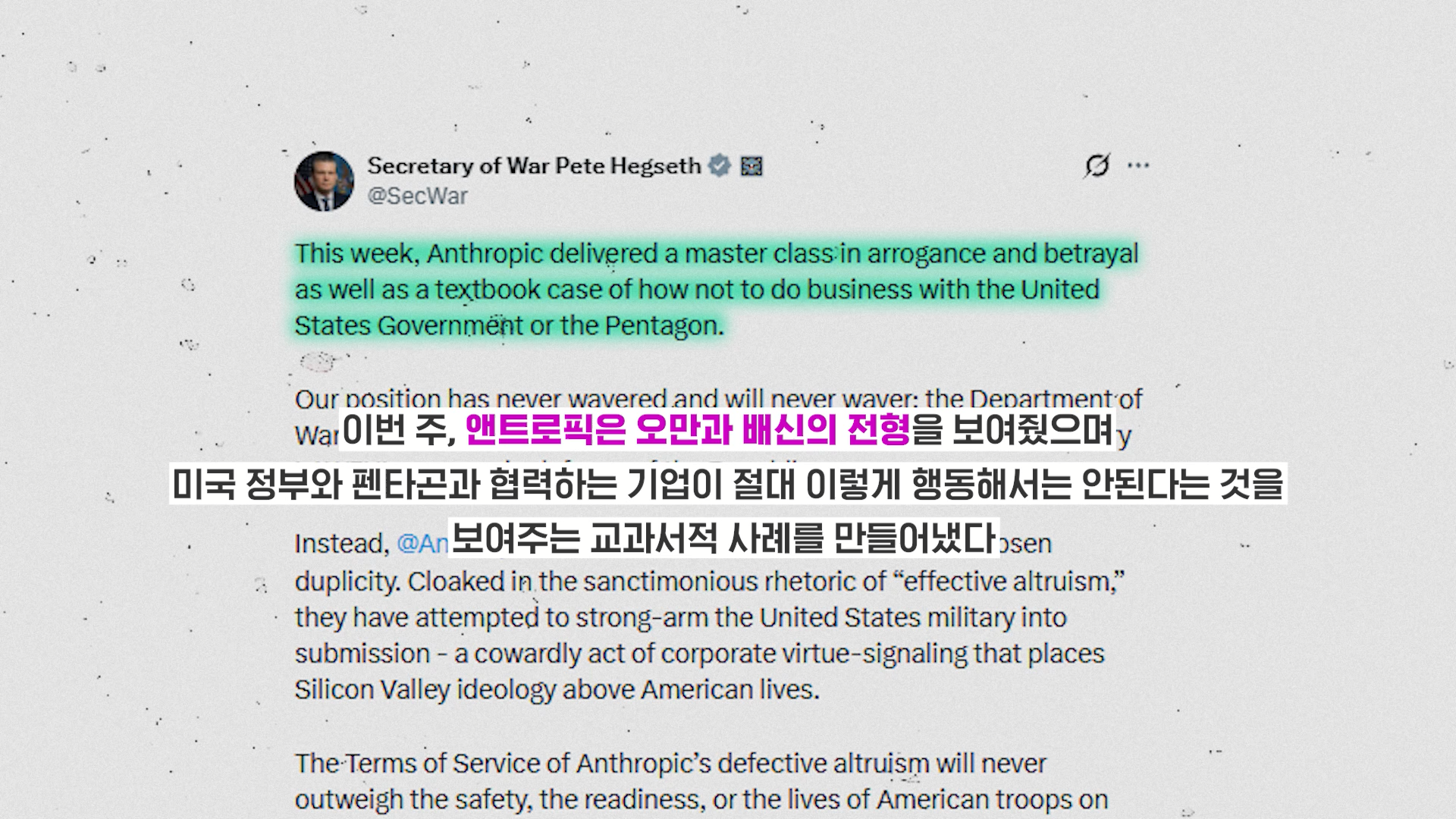 헤그세스 국방장관은 더 강한 반응을 보였어요. 앤트로픽을 두고 '오만과 배신의 극치'라고 쏘아붙이며 국가안보에 대한 공급망 위험 기업으로 지정한다고 발표했죠. 공급망 위험 기업이 되면 미군은 물론 미군과 사업을 하는 파트너 기업과도 거래가 사실상 불가능해져요.