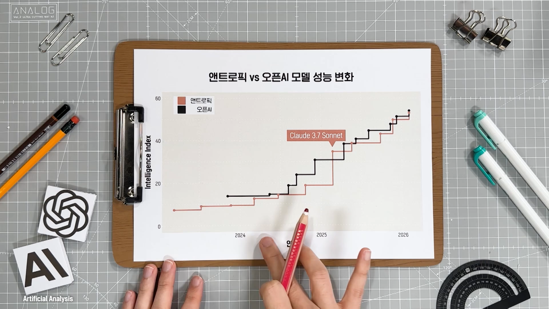 2025년 초반까지는 오픈AI의 모델 성능이 앤트로픽보다 더 좋았어요. 하지만 클로드 3.7 소넷이 처음으로 역전한 뒤에는 서로 앞서거니 뒤서거니 하면서 성능 발전을 이어오고 있죠.