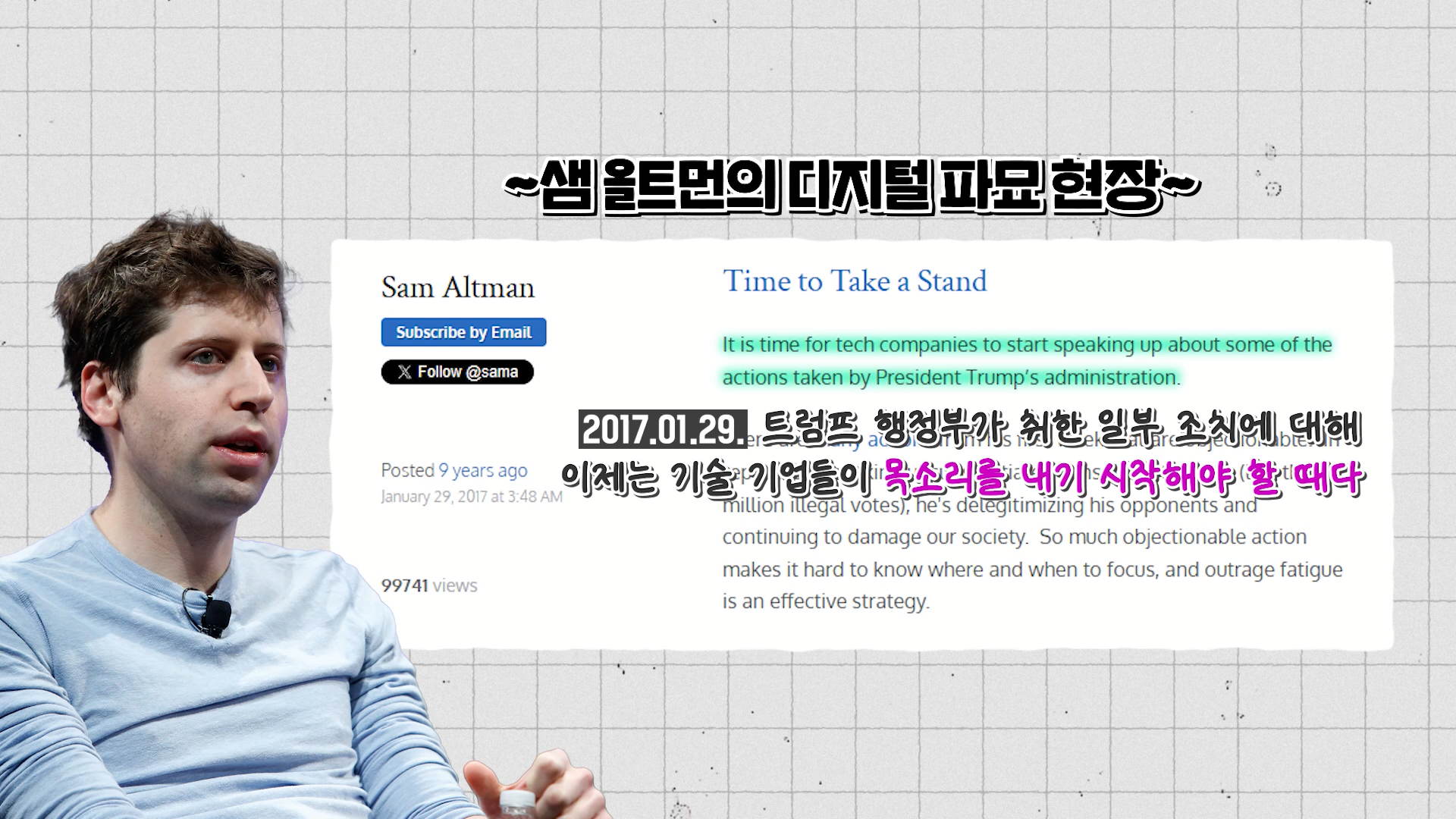 사실 트럼프 1기 때만 해도 샘 올트먼은 가장 적극적으로 트럼프를 비판했던 사람 중 한 명이었어요. 다른 IT 기업들이 힘을 모아서 트럼프에 맞서야 한다고 촉구하기도 했죠. 올트먼이 쓴 예전 블로그 글을 보면 트럼프를 히틀러에 비유할 정도로 강경한 자세를 보였습니다.