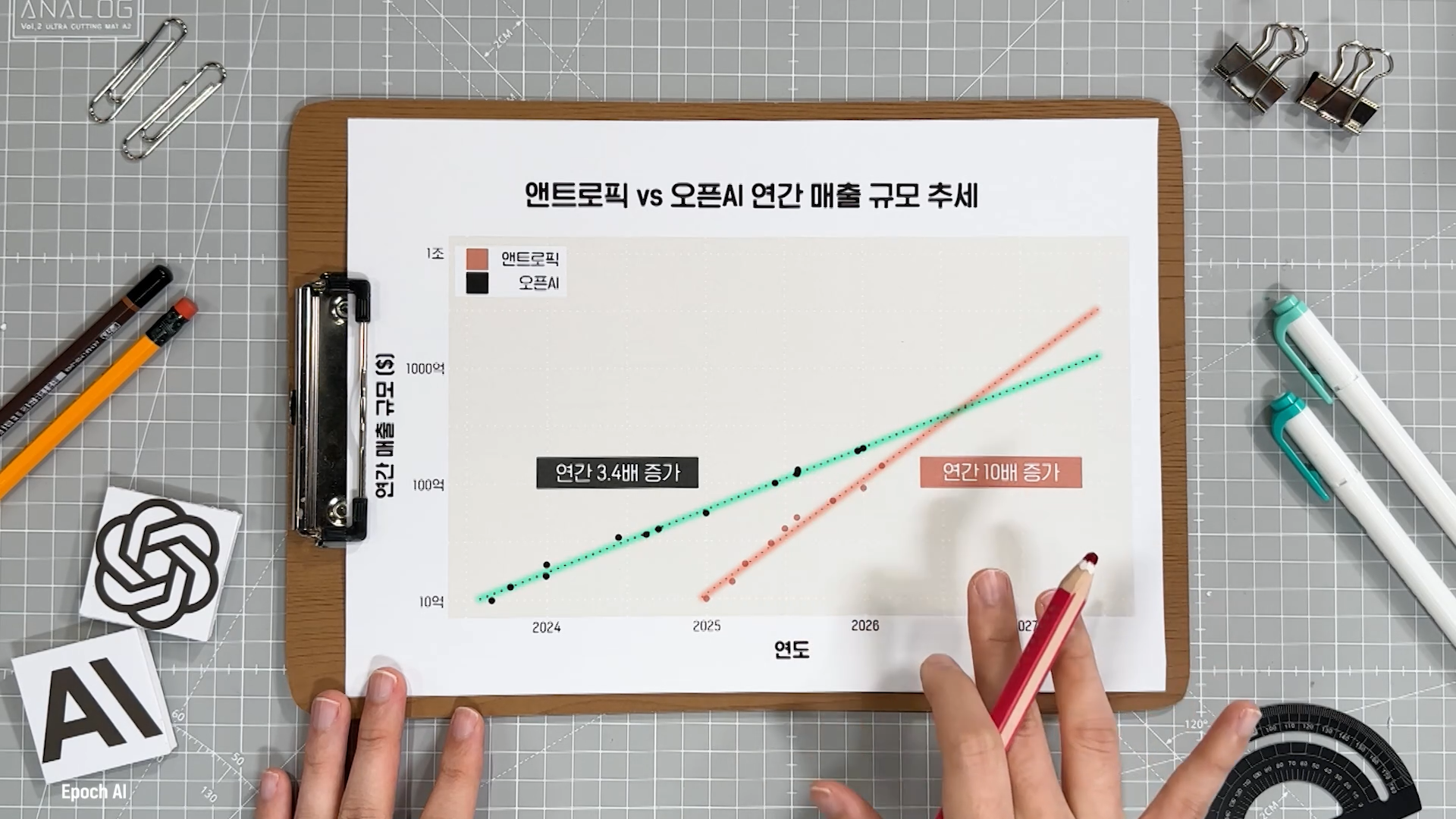 최근 오픈 AI는 연간 3.4배 성장하는 추세를 보이고 있어요. 이 흐름도 나쁜 건 아니지만 앤트로픽과 비교하면 차이가 심합니다. 앤트로픽은 10억 달러 돌파 이후 매년 10배씩 성장하는 모습이거든요. 이러한 추세가 지속된다면 올해 중반에 두 기업 사이의 연간 매출이 역전될 수도 있죠.