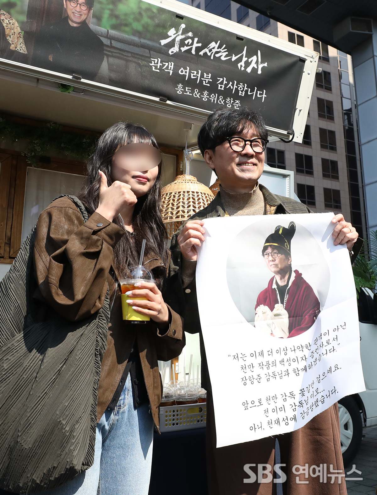 Director Jang Hang-jun of the film “The King's Warden” held a coffee truck event to thank audiences for the 10-million admissions milestone at the Plaza in front of the Press Center in Jung-gu, Seoul, on the afternoon of March 12, and posed for a commemorative photo with a citizen.