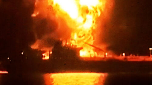 바다 한복판 유조선에서 거대한 불기둥이 치솟아 오르고, 유출된 기름에 해수면 위에도 불이 붙었습니다.