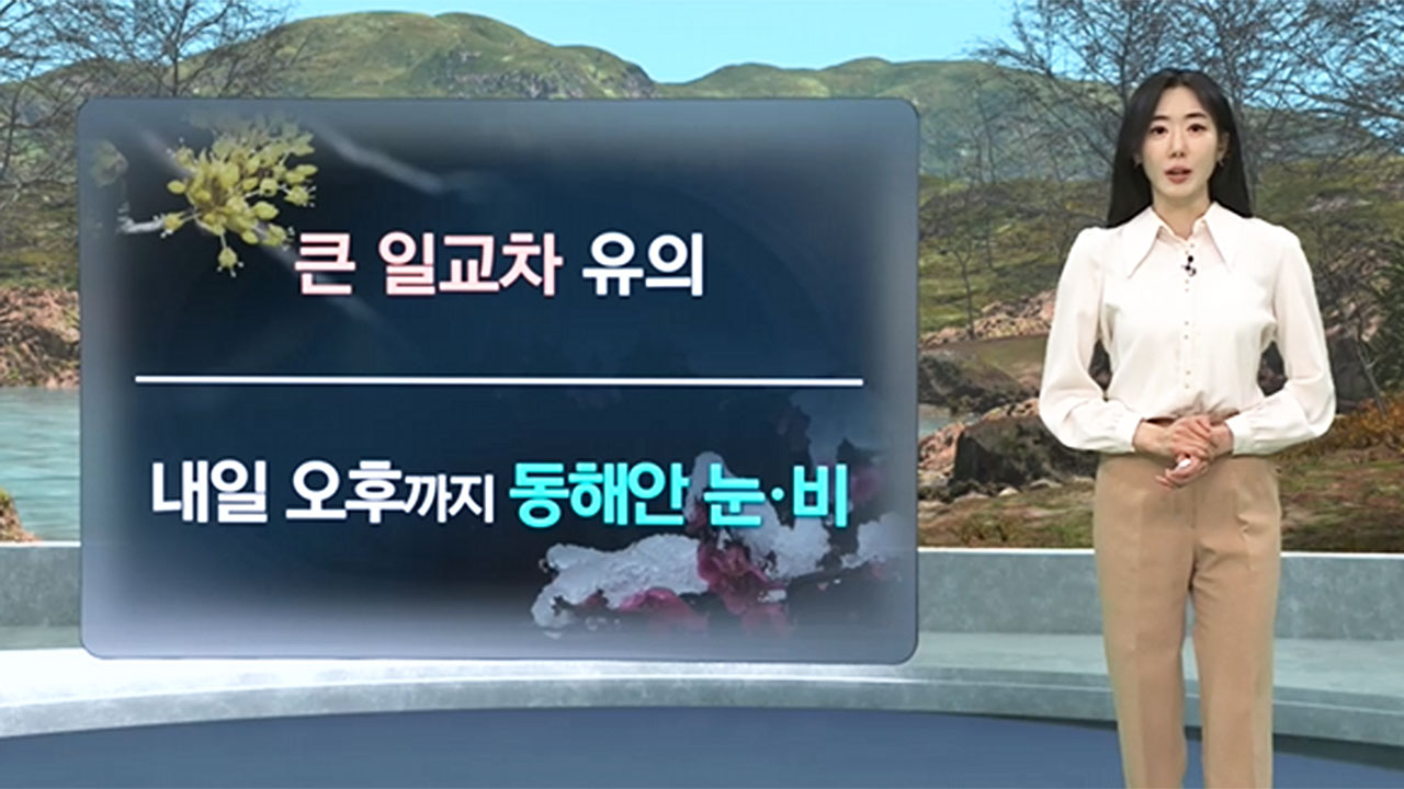 동해안 지방은 내일 오후까지 비나 눈이 더 이어지겠습니다.