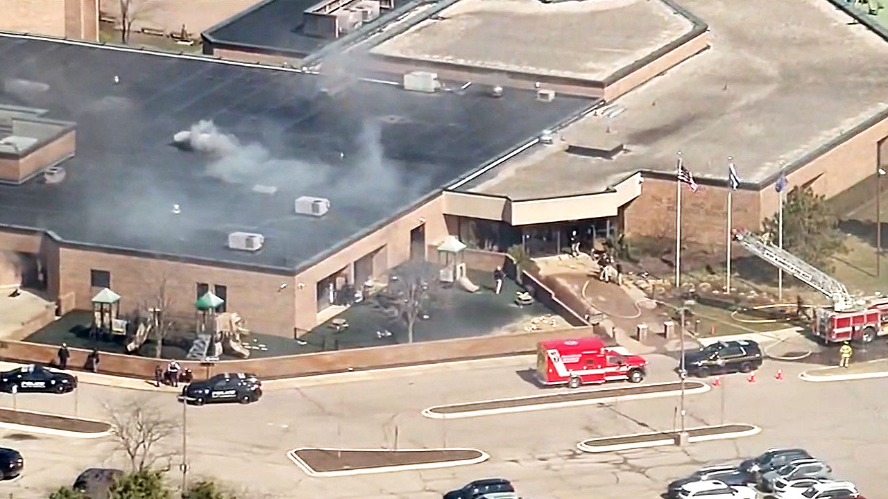 미국 미시간주 디트로이트 근처 웨스트 블룸필드 타운십에 있는 유대교 회당에서 검은 연기가 피어오릅니다.