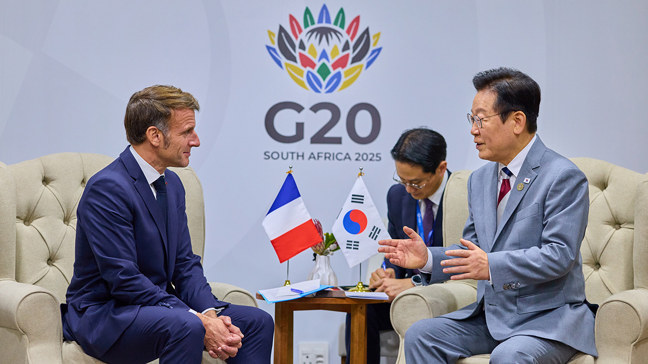 ▲ 이재명 대통령과 에마뉘엘 마크롱 프랑스 대통령이 지난해 11월 22일(현지시간) 남아프리카공화국 요하네스버그 나스렉 엑스포센터에서 정상회담을 하고 있다