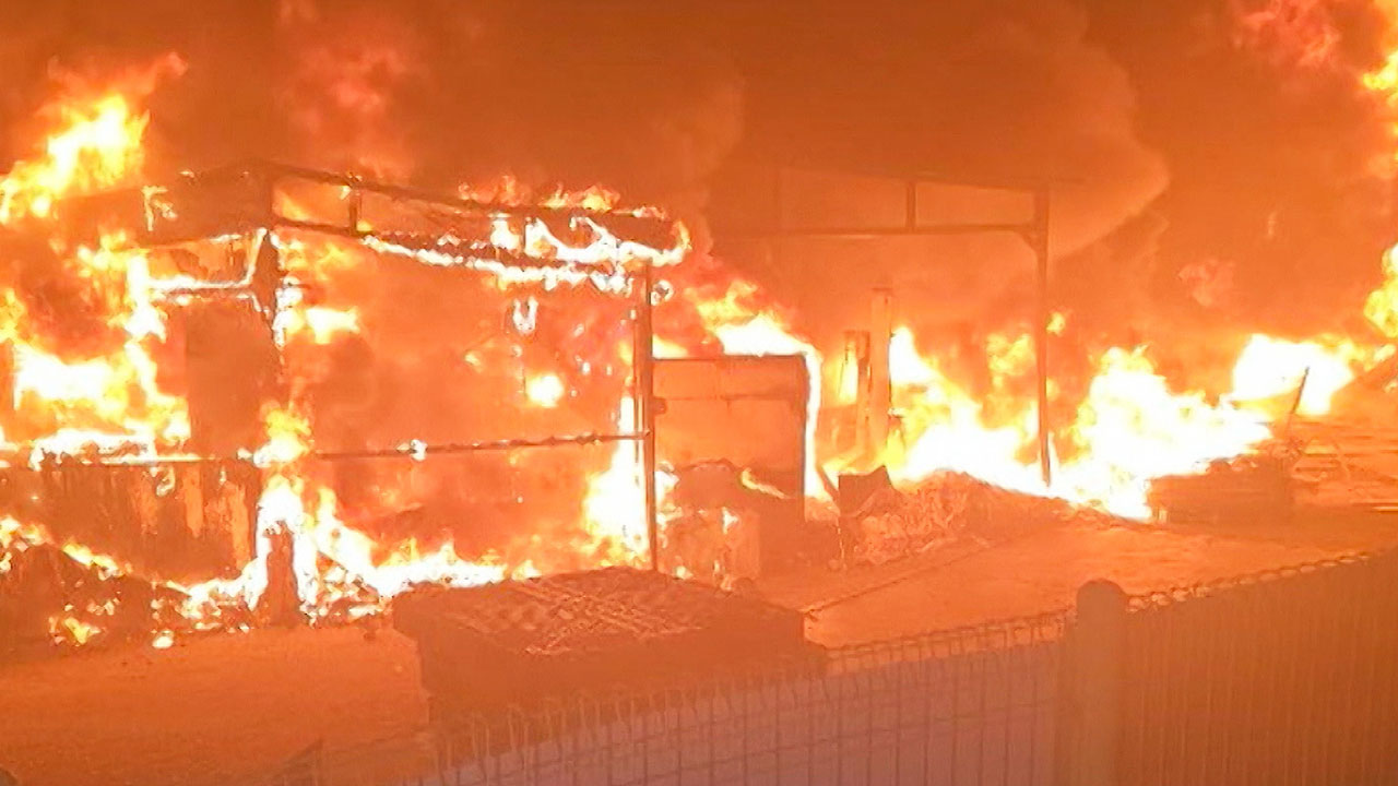 시뻘건 불길이 쓰레기 창고 위로 피어오릅니다.