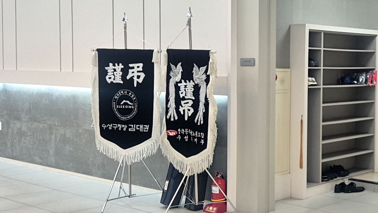 오늘(15일) 오전 대구 수성구의 장례식장 입구에는 A씨가 근무했던 수성구청장과 공무원노조 측의 근조기가 놓여 있었습니다.