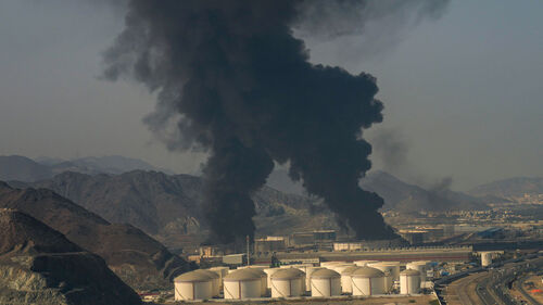 ▲ 이란의 드론 공격을 받은 아랍에미리트(UAE) 푸자이라의 석유 시설에서 화염과 연기가 피어오르고 있다.