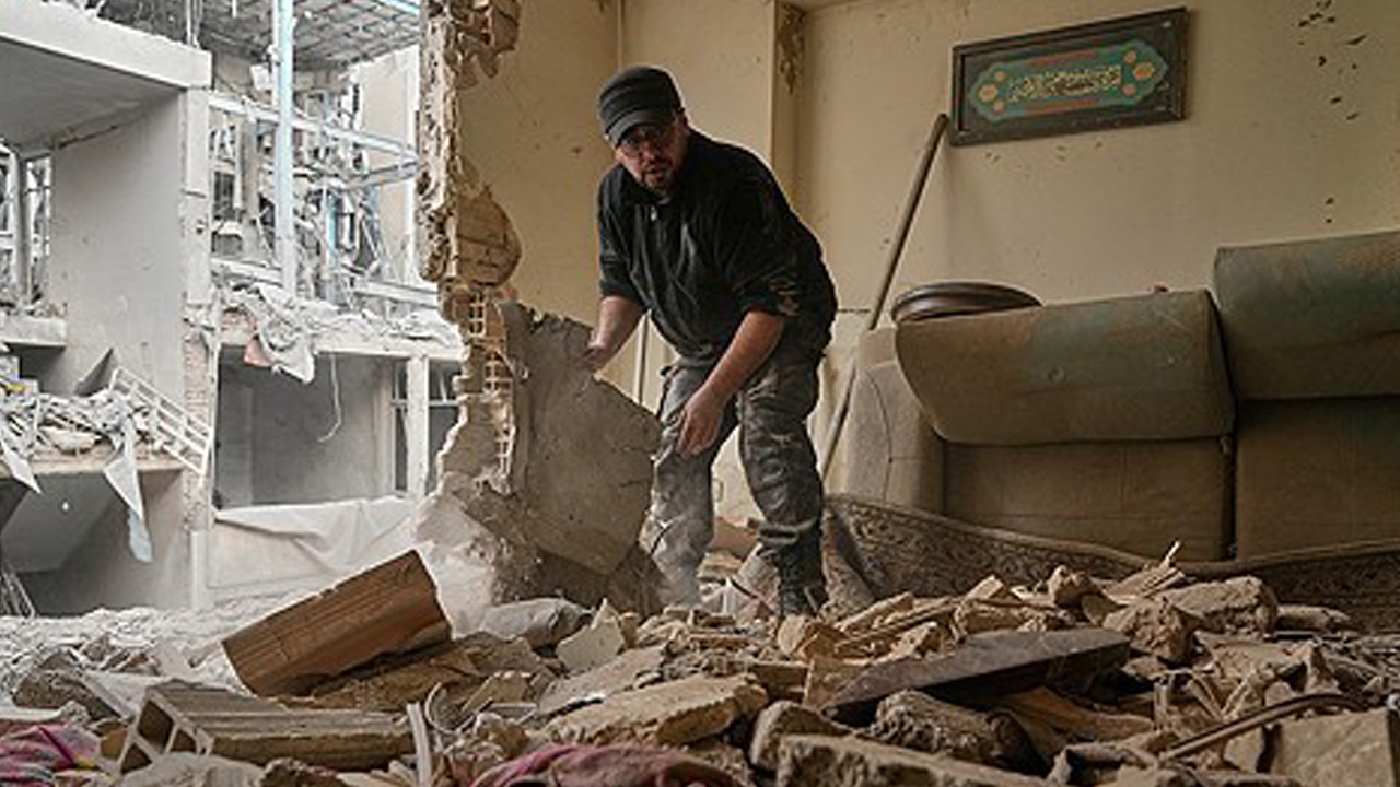▲ 2026년 3월 15일 이란 수도 테헤란에서 폭격당한 경찰서 주변 아파트의 거주자가 잔해를 치우고 있다.