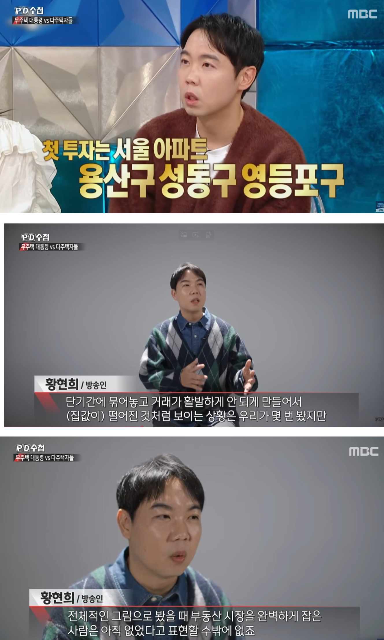 지난 14일 방송된 MBC 'PD수첩'에는 황현희의 부동산 투자 관련 인터뷰가 공개됐다. 앞서 황현희는 여러 예능 프로그램을 통해 다주택을 보유하고 있다고 밝힌 바 있다. 그는 서울 용산과 성동, 영등포 등을 중심으로 임대 사업을 하고 있다고 설명했다.