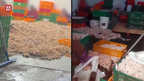 보도에 따르면 공장 바닥에는 오수가 고여 있고 악취가 진동하는 가운데 닭발이 바닥에 그대로 쌓여 있었습니다.