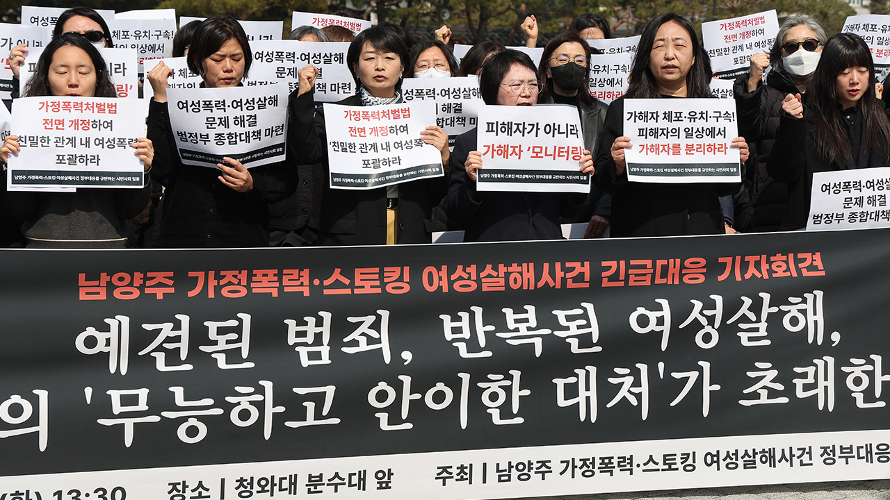 이들은 '피해자가 아닌 가해자 모니터링'. '가정폭력처벌법 전면 개정해 친밀한 관계 내 여성폭력 포함하라' 등 문구가 적힌 피켓을 들고 "공허한 정부 대책 전면 개편하라" 등 구호를 외쳤습니다.