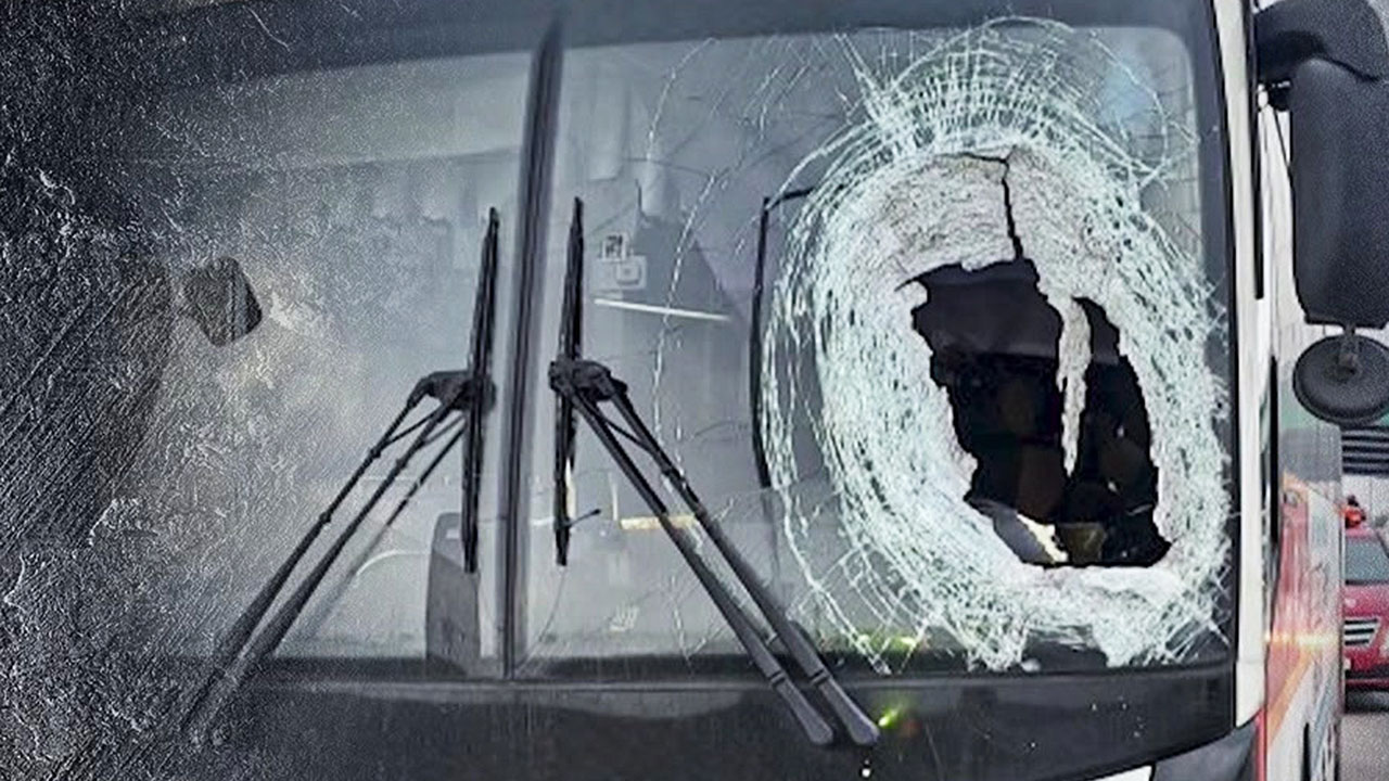앞 유리창이 크게 파손된 고속버스 한 대가 도로를 위태롭게 달립니다.