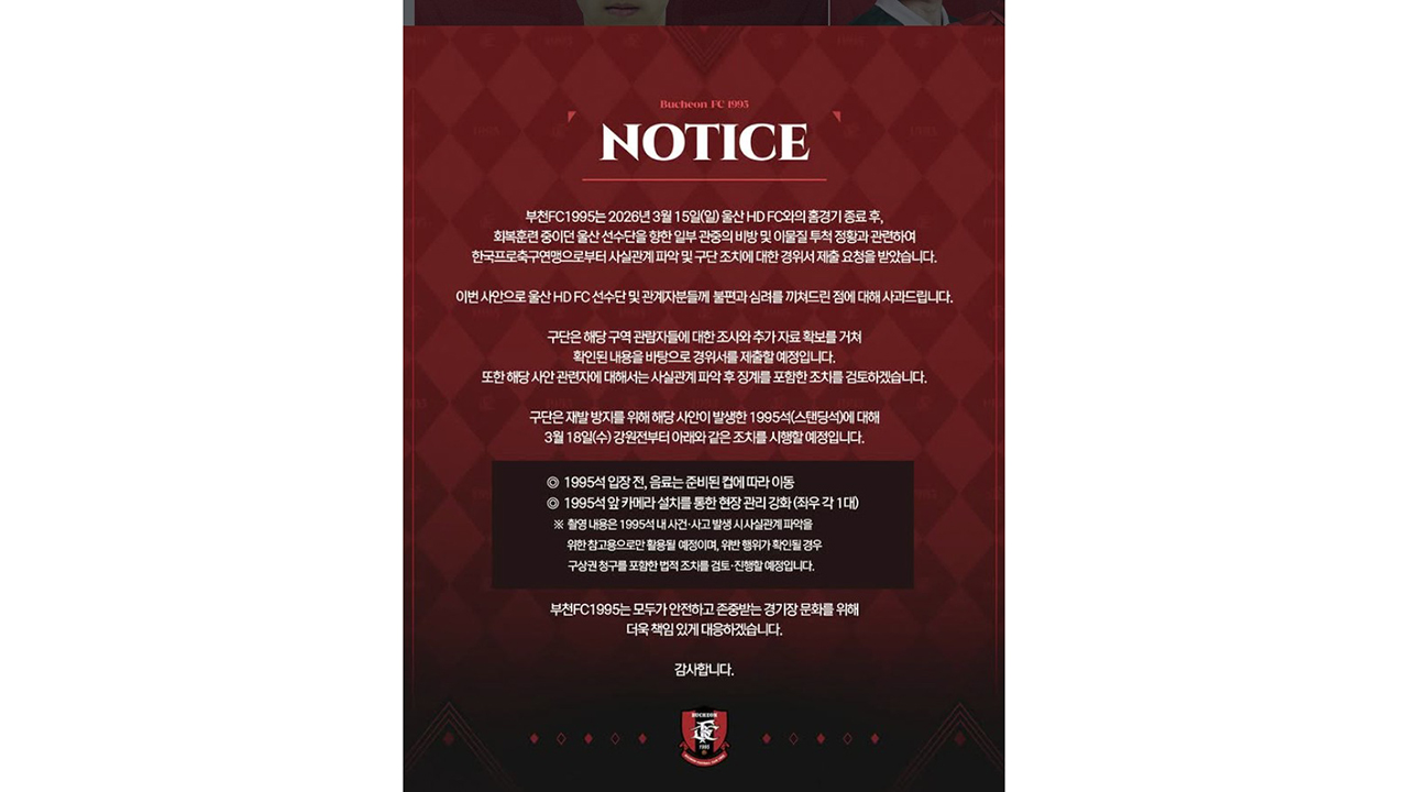 앞서 부천 구단은 K리그2에서 뛰던 2024년 10월 충북청주와 경기 후에도 서포터스가 상대 선수와 대립하는 과정에서 얼음 등 이물질을 그라운드로 투척해 프로축구연맹으로부터 제재금 500만 원과 함께 서포터스석 2경기 폐쇄 징계를 받은 바 있습니다.