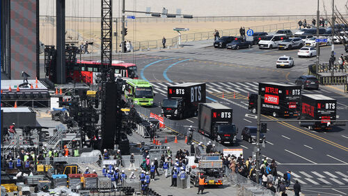 ▲ 그룹 방탄소년단(BTS)의 광화문 공연을 앞둔 19일 서울 광화문 광장에서 공연 준비 작업이 이뤄지고 있다.