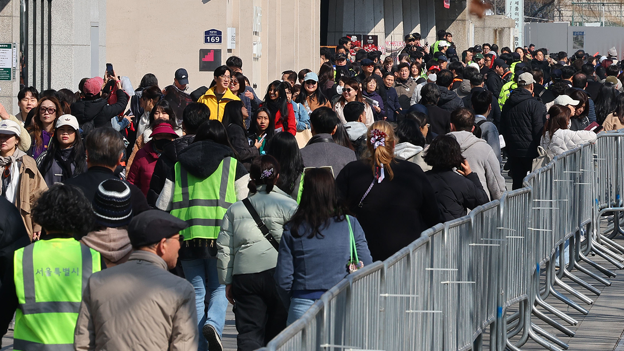 ▲ 그룹 방탄소년단(BTS)이 정규 5집 '아리랑'(ARIRANG) 발매를 기념해 무료 공연 'BTS 컴백 라이브: 아리랑'을 여는 21일 서울 광화문 광장에서 '아미'(BTS 팬덤)들과 시민들이 길을 걷고 있다.