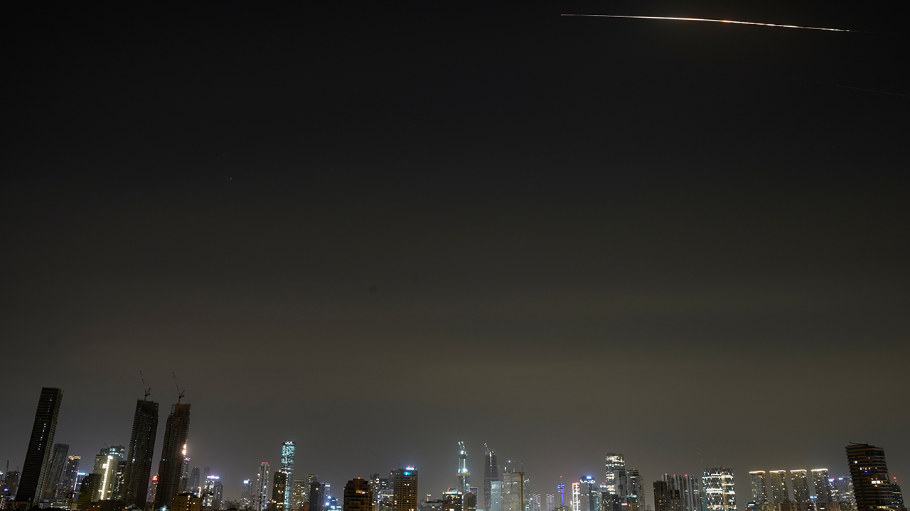 ▲ 이른 아침 요격된 이란산 미사일의 잔해가 텔아비브 상공을 가로지르고 있다.