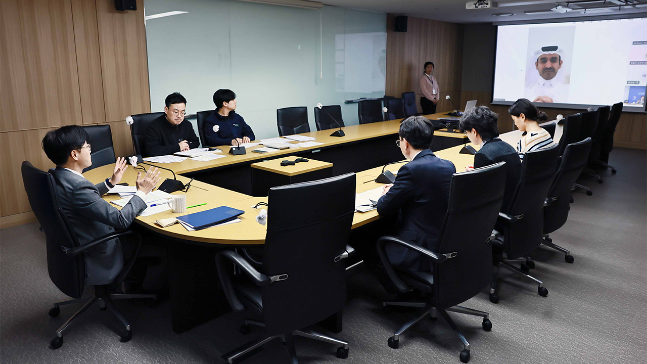 ▲ 김정관 산업통상부 장관이 지난 20일 정부세종청사 산업부 영상회의실에서 사드 빈 셰리다 알 카비 카타르 에너지 담당 국무장관과 화상으로 면담하고 있다.