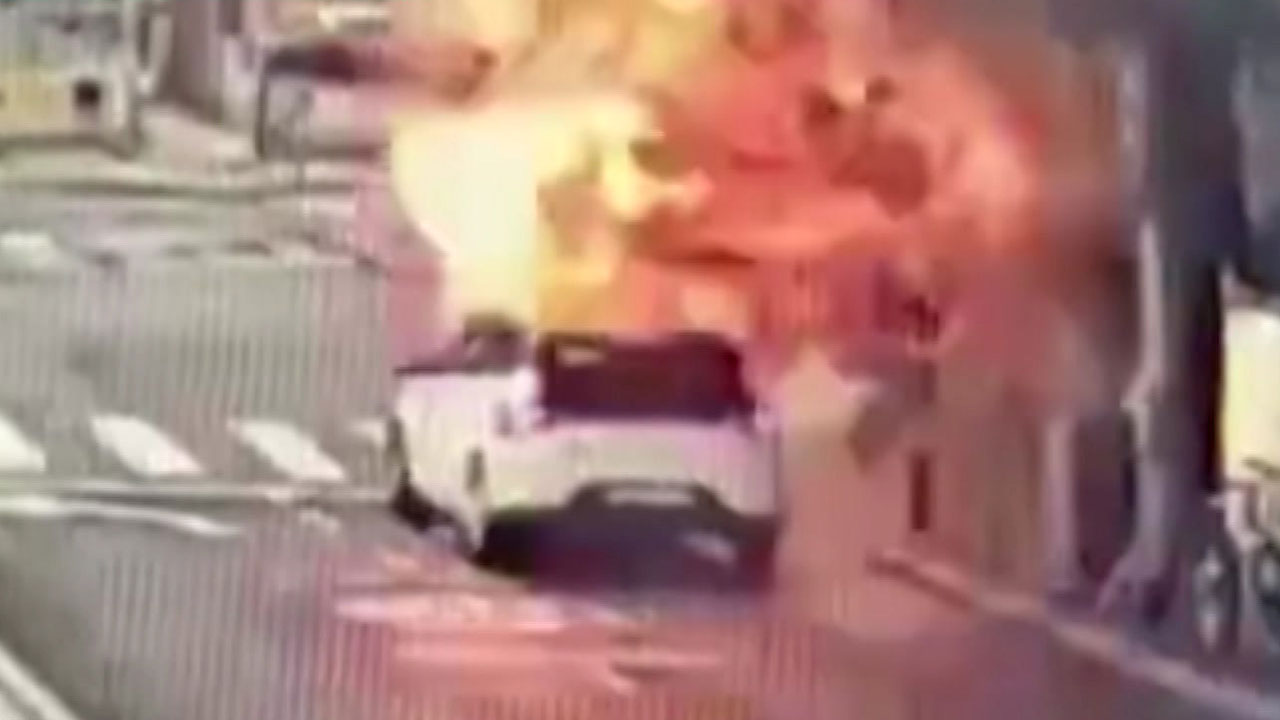 이스라엘 텔아비브 시내를 달리던 차량이 신호에 잠시 멈추는 순간, 이란이 쏘아 보낸 집속탄 파편이 떨어져 폭발합니다.