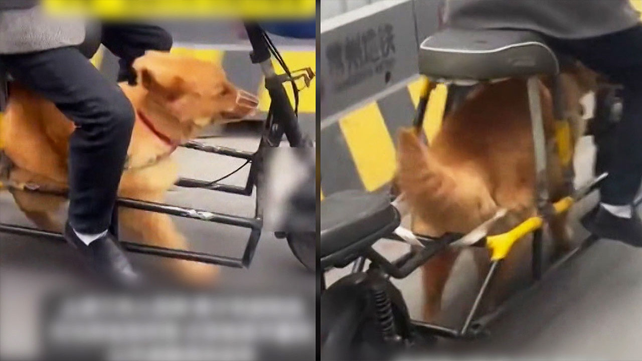 그런데 오토바이 뼈대 안에서 웬 대형견 1마리가 쉴 새 없이 달리고 있습니다.