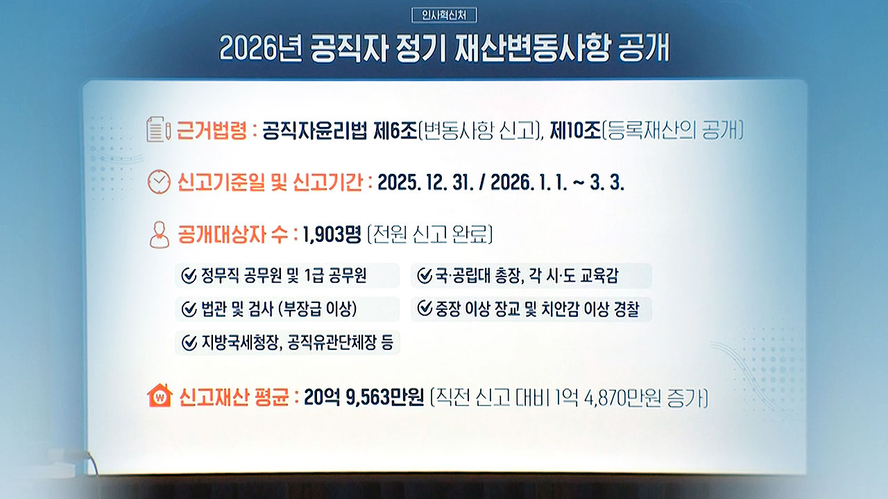 [천지윤/인사혁신처 윤리복무국장 : 재산 증가 요인으로는 저축, 상속, 주식 가격 상승 등에 따른 순자산 증가가 1억 944만 원이고, 토지나 건물 공시 가격 상승 등으로 인한 가액 증가액이 3,926만 원입니다.]
