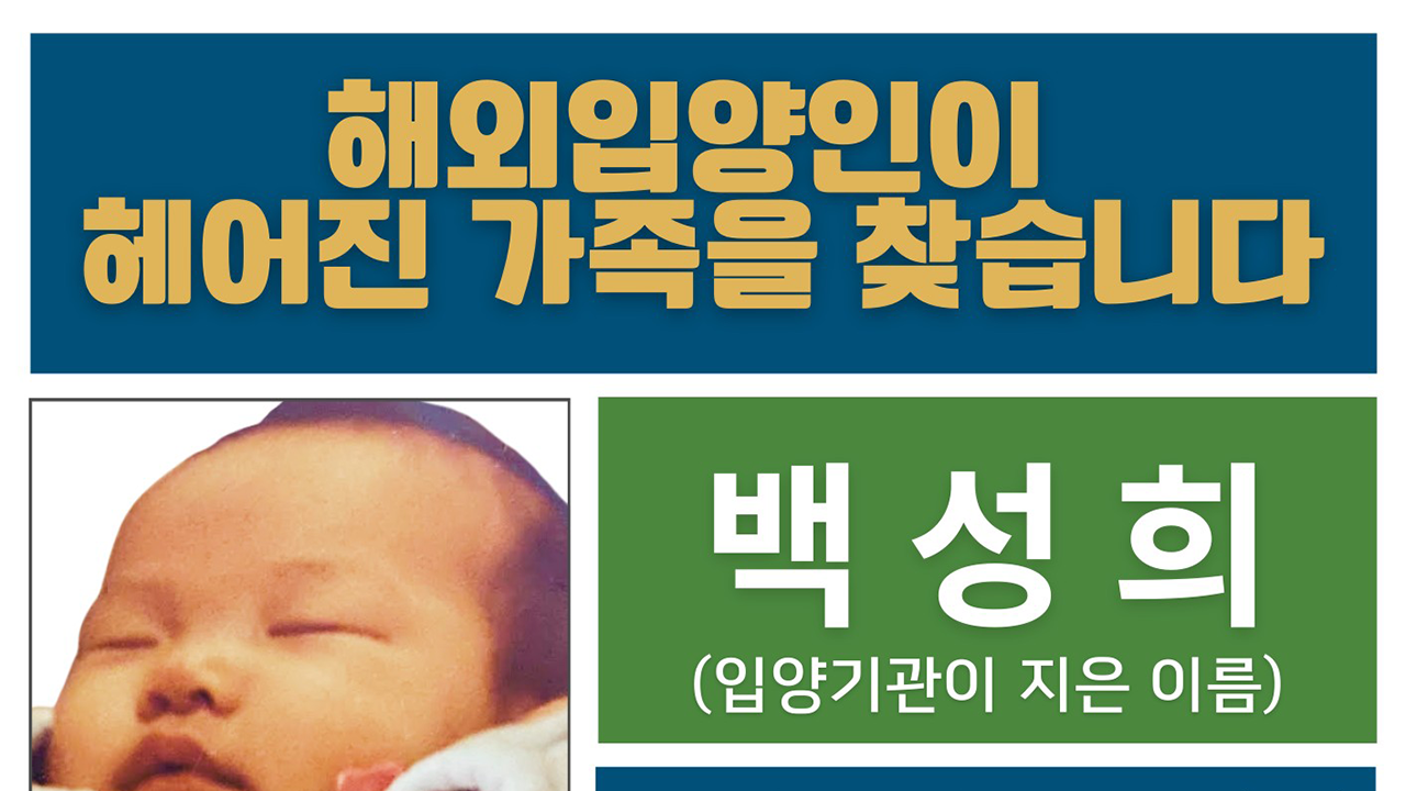 최근 남편과 함께 한국에 들어와 충북 충주에서 친모를 찾고 있는 백성희(42·입양기관이 지은 이름·노르웨이명 스테파니 스카우비-오케르비크) 씨는 오늘(26일) 언론에 "부모님을 찾게 되면 꼭 안아드리고 싶다. 저는 잘 살았고, 지금도 잘 살고 있다는 것도 알려드리고 싶다"고 말했습니다.