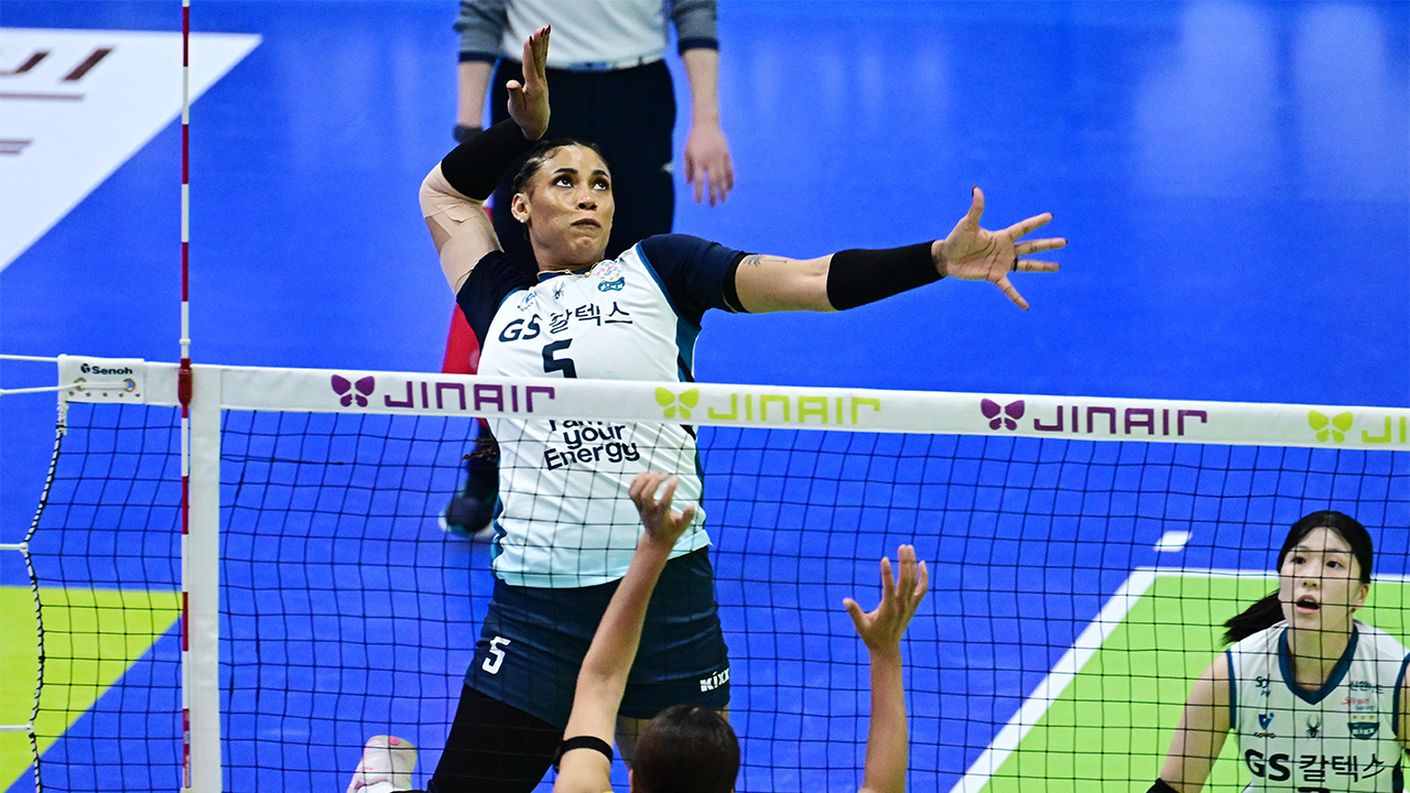 ▲ 현대건설과 PO 1차전에서 공격하는 GS칼텍스의 실바