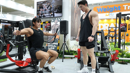 ▲ 26일 서울 강남구 삼성동 코엑스에서 열린 2026 서울국제스포츠레저산업전에서 참관객들이 참가업체의 기구를 사용해 운동하고 있다.