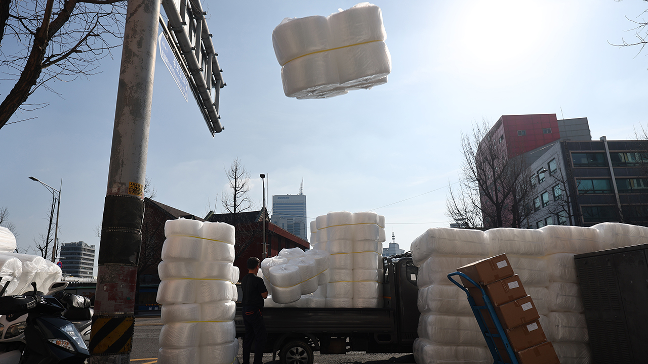 ▲ 중동 사태에 따른 원료 수급 불안 영향으로 '비닐 대란'이 우려가 확산되고 있는 지난 25일 서울의 한 시장에서 비닐 관련 용품을 정리하고 있다.