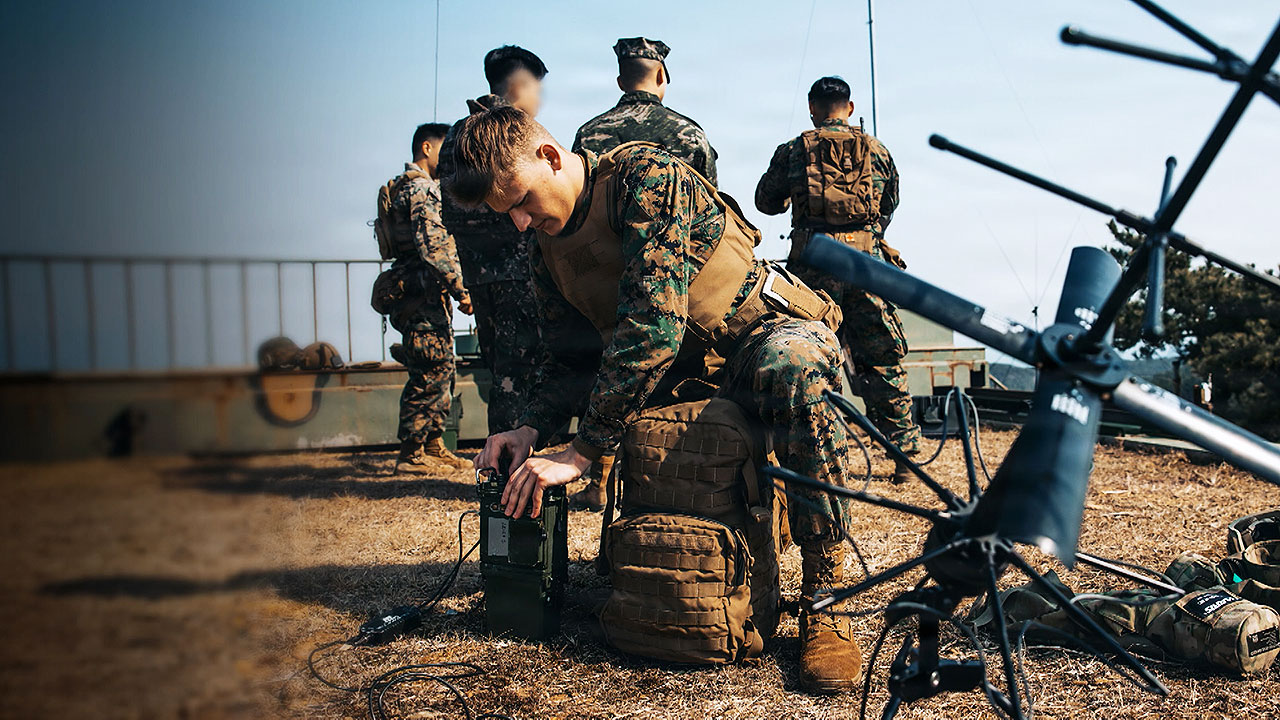 미군 장교들이 위성 통신 안테나와 지상 송수신기를 설치합니다.